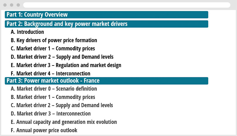 - 分析性国家报告,包括到 2050 年的年度市场预测(需求、容量、发电量、价格)。
