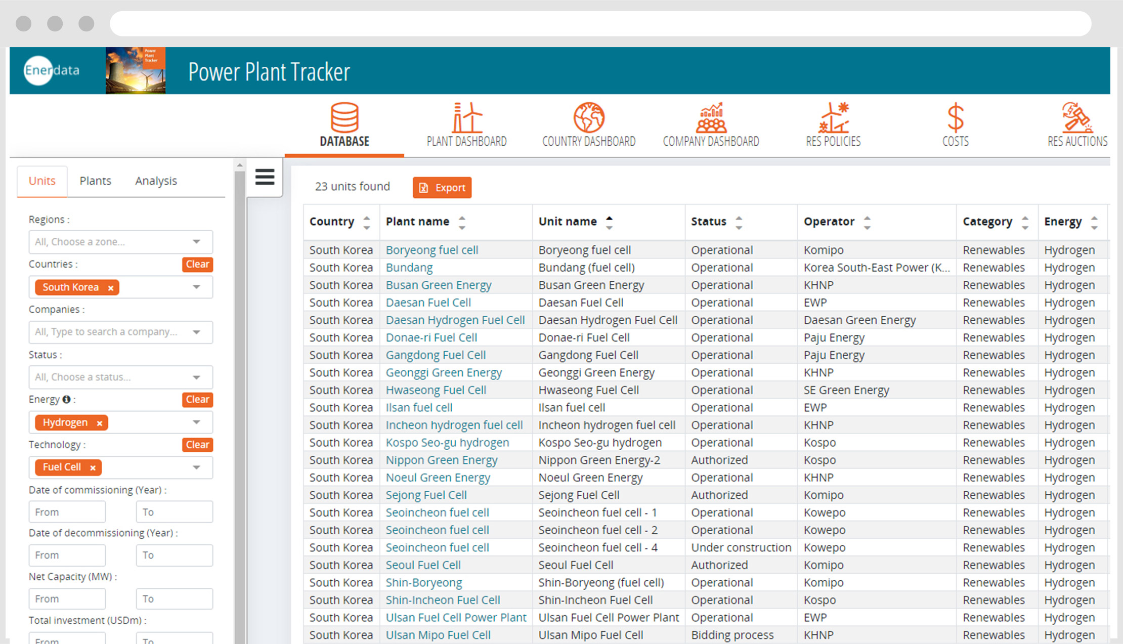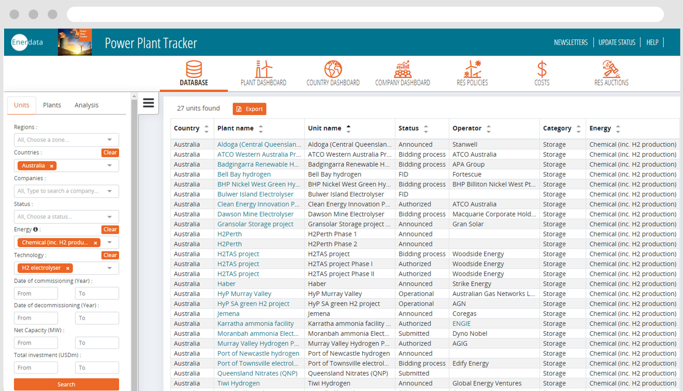 发电厂跟踪》涵盖所有使用氢作为能源或储氢的发电项目。氢气生产项目包含在我们的氢气及衍生物项目数据库中 : " H2 and Derivatives Projects Database".